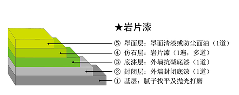 好雅麗巖片漆是專仿天然花崗巖石材而設(shè)計,于常規(guī)彩砂真石漆基礎(chǔ)上復(fù)合天然無機巖片,巖片于漆涂膜中錯綜分布,排列,其涂膜完全接近天然花崗巖的美麗外觀和質(zhì)感效果。同時巖片也對真石漆涂層的強韌性有明顯增強作用;通過一道噴涂即獲得天然花崗巖石材的質(zhì)感紋理效果,也突破了常規(guī)真石漆套色噴涂的施工難度。